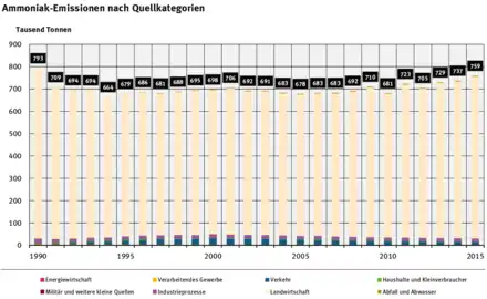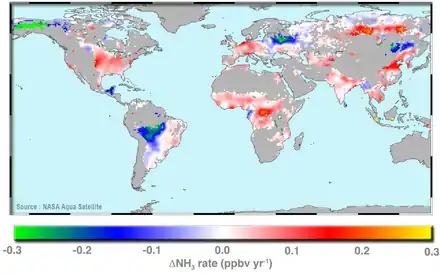 Sur terre, il est essentiellement piégé dans l'écorce terrestre (sels ammoniacaux minéraux tels que bicarbonates, nitrates, nitrites, chlorures, phosphates) ou dans la matière organique (charbon, tourbe, pétrole). En excès dans l'air, c'est un polluant acidifiant et eutrophisant de l'environnement. Après une amélioration de 1990 à 2011[26], ses teneurs dans l'air, maintenant suivies par satellite, sont reparties à la hausse en Europe et en France, en raison essentiellement des pratiques agricoles plus industrielles (donnée 2016)[27]. En ville et sur les axes de transport, il est issu du trafic routier pour 40 à 60 %[28], mais à échelle du pays, en 2011, il provient à 94 % des émissions de NH3[29] d'origine agricole. L'élevage via les fumiers et lisiers en est la 1re source[30],[31]. Sa teneur dans l'air devrait être infime (hormis en présence d'excréments ou urines en décomposition, d'une fermentation par des micro-organismes en milieu confiné ou d'une putréfaction en milieu anaérobie).