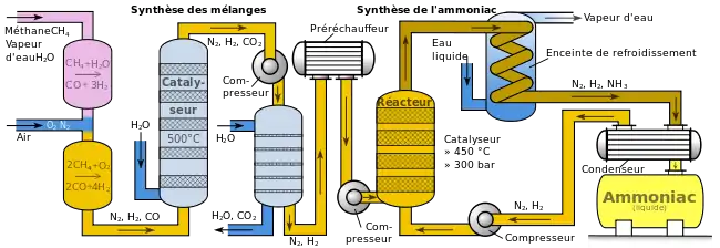 - le procédé Fauser, mis au point en Italie, adopté tardivement par ONIA dans son usine de Soulon, qui se fonde à partir d'un mélange à 250 atm et 550 °C[53].