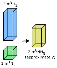 La synthèse de l'ammoniac est exothermique, dégageant 12,9 calories par mole à la pression atmosphérique. Elle implique deux gaz, l'azote et l'hydrogène. Dans les conditions « ambiantes », le produit final se présente sous la forme d'un gaz incolore (produisant une fumée de condensation à haute concentration) et dégageant une très désagréable odeur putride.