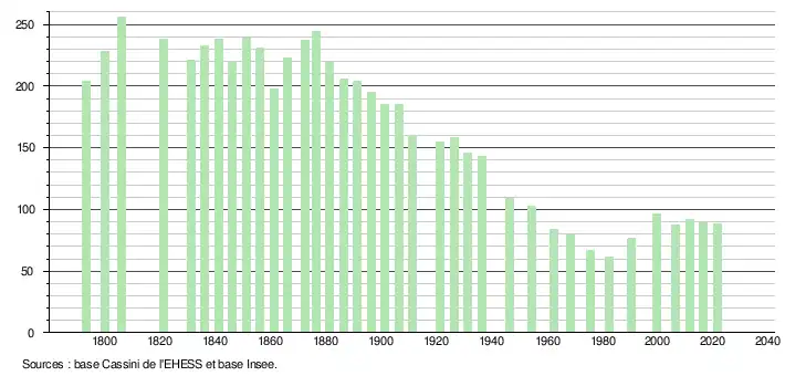 L'évolution du nombre d'habitants est connue à travers les recensements de la population effectués dans la commune depuis 1793. Pour les communes de moins de 10 000 habitants, une enquête de recensement portant sur toute la population est réalisée tous les cinq ans, les populations légales des années intermédiaires étant quant à elles estimées par interpolation ou extrapolation[18]. Pour la commune, le premier recensement exhaustif entrant dans le cadre du nouveau dispositif a été réalisé en 2006[19].