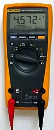 - l'ampèremètre thermique est composé d'un fil résistant dans lequel le courant à mesurer circule[4]. Ce fil s'échauffe par effet Joule, sa longueur variant en fonction de sa température, provoque la rotation de l'aiguille, à laquelle il est fixé. L'ampèremètre thermique n'est pas polarisé[4]. Il n'est pas influencé par les champs magnétiques avoisinants, ses indications sont indépendantes de la forme (alternatif ou continu de forme quelconque) et de la fréquence du courant[4]. Il peut donc être utilisé pour mesurer la valeur efficace des courants alternatifs jusqu'à des fréquences très élevées[4]. Il incorpore très souvent une compensation de température destinée à maintenir sa précision malgré les variations de température ambiante[4].