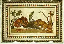 La mosaïque de la chasse à l'amphithéâtre de Smirat, datée des années 235-250 (voire 240-250) selon Azedine Beschaouch[66], est un document exceptionnel sur le même sujet : des chasseurs y sont figurés au moment où des léopards s'effondrent alors qu'un texte explique que le dernier moment du spectacle est celui du paiement des festivités[67] ; un héraut demande 500 deniers par léopard[68] qu'un dénommé Magerius paye après avoir été sollicité par la foule[69]. Il débourse le double de la somme demandée, soit 4 000 deniers ; cet évergétisme témoigne en quelque sorte d'une imitation de ce qui se passe à Rome dans la procédure des jeux questoriens[70].