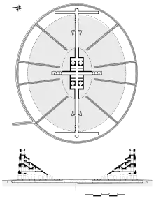 La forme générale de l'édifice est celle d'une ellipse dont les axes mesurent 148 et 122 mètres ; les axes de l'arène mesurent respectivement 65 et 39 mètres[45], son périmètre se monte à 427 mètres[8]. La construction avait une hauteur de 36 mètres[49].