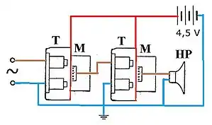 Un écouteur de téléphone accouplé par une même membrane à un « microphone au charbon » modulant l'électricité (d'une pile) pour alimenter le haut-parleur.