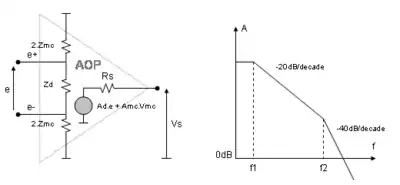 Avec G0 le gain continu et f1, la fréquence de coupure à 3 dB. Le gain G0 vaut généralement entre 100 et 130 dB pour un AOP de précision et entre 60 et 70 dB pour un AOP rapide[22]. Pour les applications nécessitant une bande passante plus importante, il existe des AOP sous-compensés ou, plus rarement, non compensés. Pour ces amplificateurs, le constructeur précise le gain minimal pour lequel l'AOP reste inconditionnellement stable (pour plus d'informations, se référer au paragraphe compensation fréquentielle).