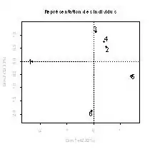 4. Représentations des modalités des variables qualitatives comme en ACM (une modalité est au barycentre des individus qui la possèdent). Pas de variables qualitatives dans l'exemple.