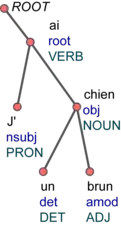 Actuellement, la représentation des structures syntaxiques la plus populaire est celle en dépendances [Note 2], en raison du bon compromis expressivité/efficacité des algorithmes qu'elle propose [26],[27], et des performances obtenues pour une grande variété de langues [28],[29]. Avec cette représentation, ce sont très souvent des modèles probabilistes localement discriminants ou discriminants qui sont utilisés, contrairement à la représentation en constituants, pour laquelle les modèles génératifs sont plus compétitifs [13]. Toutefois, il est intéressant de relever que certains systèmes récents (p. ex. [30], [31]), particulièrement performants, sont fondés sur l'assemblage de modèles de types différents (technique d'ensemble ou system combination) [32].