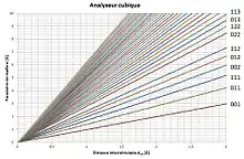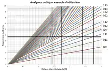 Puisque les valeurs des indices des plans hkl sont entières par définition, il est possible de tracer une droite pour chaque triplet d’indices hkl possibles. Voici un exemple d’analyseur cubique :