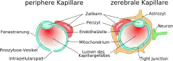 Les capillaires sont tapissés – comme les vaisseaux périphériques – de cellules endothéliales. L'endothélium des capillaires périphériques possède, pour l'échange de l'eau et des matières qui y sont dissoutes ou en suspension entre le sang et le liquide intercellulaire du tissu environnant, des ouvertures (fenêtres) d'environ 50 nm de diamètre et des fentes entre cellules de 0,1 à 1 µm de large. Entre les cellules endothéliales du cerveau, il n'y a au contraire aucun fenestrage, ni fente intercellulaire[4], ce pourquoi on parle aussi d'un « endothélium continu »[5]. La membrane cellulaire du côté de l’intérieur du capillaire (« luminale ») diffère considérablement du point de vue de la composition en protéines de celle de la membrane du côté du tissu interstitiel (« apicale »).