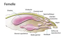 Chez la femelle, le système reproductif est composé d'une paire d'ovaires, des glandes accessoires, d'une ou de plusieurs spermathèques et des oviductes latéraux qui relient ces parties ensemble. Les ovaires sont constitués d'un certain nombre de tubes à œufs, appelés ovarioles. Selon les espèces, les ovaires produisent un nombre variable d'œufs.