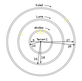 À l'origine, après la séparation du chaud et du froid, se forma une boule de flamme qui entoura la Terre comme l'écorce d’un arbre. Cette boule se déchira pour former le reste de l'Univers. Celui-ci ressemblait à un système de roues creuses concentriques emplies de feu et aux parois percées d’une bouche, comme le trou d’une flûte. De la même taille que la terre, le Soleil était donc le feu que l’on voyait à travers un trou sur la roue la plus éloignée et une éclipse correspondait à la fermeture de ce trou. Le diamètre de la roue solaire égalait vingt-sept fois celui de la Terre (ou vingt-huit, selon les sources[44]) et celui de la Lune dont le feu était moins intense, dix-huit fois (ou encore dix-neuf). Son trou avait la capacité de changer sa forme, expliquant ainsi les phases lunaires. Les étoiles et les planètes, plus rapprochées[45], étaient conçues sur le même modèle[46].
