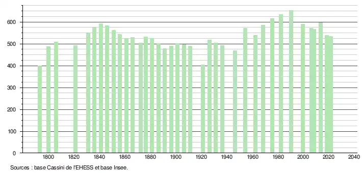 L'évolution du nombre d'habitants est connue à travers les recensements de la population effectués dans la commune depuis 1793. Pour les communes de moins de 10 000 habitants, une enquête de recensement portant sur toute la population est réalisée tous les cinq ans, les populations légales des années intermédiaires étant quant à elles estimées par interpolation ou extrapolation[18]. Pour la commune, le premier recensement exhaustif entrant dans le cadre du nouveau dispositif a été réalisé en 2008[19].