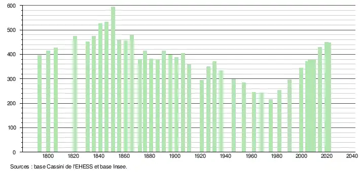 L'évolution du nombre d'habitants est connue à travers les recensements de la population effectués dans la commune depuis 1793. Pour les communes de moins de 10 000 habitants, une enquête de recensement portant sur toute la population est réalisée tous les cinq ans, les populations légales des années intermédiaires étant quant à elles estimées par interpolation ou extrapolation[13]. Pour la commune, le premier recensement exhaustif entrant dans le cadre du nouveau dispositif a été réalisé en 2004[14].