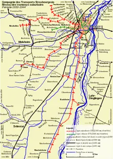 Après la réintégration de Strasbourg dans la France, la liaison avec le réseau de la rive droite du Rhin via le pont de Kehl est interrompue. Le réseau interurbain est scindé en deux parts presque égales : 98,7 km restent la propriété de la CTS, alors que 95,5 km sont cédés à la république de Bade en 1922, après que leur concession avait déjà été retirée à la CTS en 1920 et que l'exploitation avait été provisoirement confiée à la Deutsche Reichsbahn.