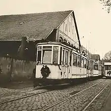 Quinze remorques à bogies et accès central sont en outre fournies par la Société Franco-Belge en 1927[27]. Le réseau interurbain ne reçoit pas tout de suite un matériel adéquat après son électrification, hormis les trois fourgons automoteurs n° II à IV. L'exploitation doit se faire par du matériel urbain (no 146-153 de 1914) en attendant la livraison des automotrices no 500-513[28] et des tracteurs n° VI à VIII, en 1929/31. Après la Seconde Guerre mondiale, la direction de la CTS est favorable à l'acquisition de matériel roulant neuf, mais se heurte au manque de moyens financiers, à l'absence de fournisseurs français et l'interdiction d'exportation en raison de la pénurie de devises[29].