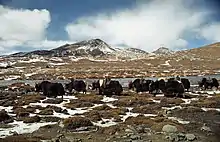 ∗ La branche nord de la piste partant de Kangding et passant par Dege (Dergué) et Chamdo, est la grande voie marchande vers Lhassa. Jacques Bacot[29] qui la parcourait en 1909, note le « Toute la journée, nous voyons de nos tentes, défiler des caravanes sans fin de yacks chargés de thé pour le Dergué, Tsiamdo et Lha-sa ». Les relais sont fixés par la coutume et chaque village qui contribue au transport du thé, reçoit une rétribution proportionnelle, payable en thé[27]. Les missionnaires d'origine hollandaise, Petrus et Susie Rijnhart qui essayaient de gagner Lhassa en 1897, disent aussi avoir observé ces immenses caravanes de yaks chargés de thé de Jyekundo, chaque caravane comportant de 1 500 à 2 000 yaks, dirigée par des marchands bien mis et sur de belles montures[23]. Mais la région était infestée de brigands. Quelques jours plus tard, les Rijnhart entendent dire que cinquante voleurs s'étaient emparés des yaks et de leurs chargements après avoir tué plusieurs caravaniers. Ils voient aussi sur le bord des pistes des cadavres d'hommes et d'animaux abandonnés par les caravanes. À la saison des pluies ou au moment du dégel, les pistes détrempées devenaient de vrais bourbiers dans lesquels les animaux et les hommes s'enlisaient.
