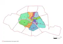 En 1860, l'extension de Paris jusqu'à l'enceinte de Thiers donne lieu à un nouveau découpage en vingt arrondissements[4], dont la répartition diffère totalement de celle des douze anciens. Cette division est toujours en vigueur, à cette réserve que certains arrondissements ont été légèrement agrandis depuis, en même temps que Paris.