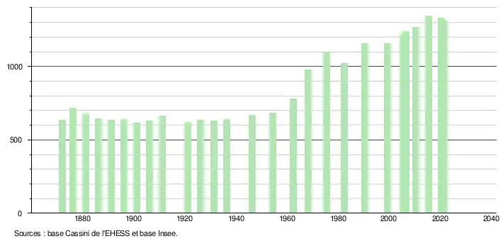 L'évolution du nombre d'habitants est connue à travers les recensements de la population effectués dans la commune depuis 1872. Pour les communes de moins de 10 000 habitants, une enquête de recensement portant sur toute la population est réalisée tous les cinq ans, les populations légales des années intermédiaires étant quant à elles estimées par interpolation ou extrapolation[21]. Pour la commune, le premier recensement exhaustif entrant dans le cadre du nouveau dispositif a été réalisé en 2005[22].