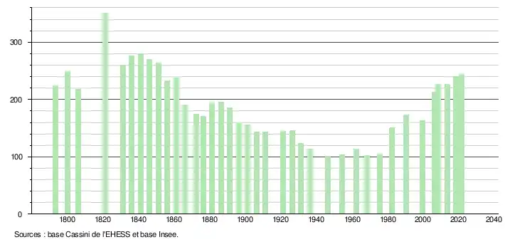 L'évolution du nombre d'habitants est connue à travers les recensements de la population effectués dans la commune depuis 1793. Pour les communes de moins de 10 000 habitants, une enquête de recensement portant sur toute la population est réalisée tous les cinq ans, les populations légales des années intermédiaires étant quant à elles estimées par interpolation ou extrapolation[22]. Pour la commune, le premier recensement exhaustif entrant dans le cadre du nouveau dispositif a été réalisé en 2008[23].