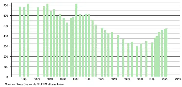 L'évolution du nombre d'habitants est connue à travers les recensements de la population effectués dans la commune depuis 1793. Pour les communes de moins de 10 000 habitants, une enquête de recensement portant sur toute la population est réalisée tous les cinq ans, les populations légales des années intermédiaires étant quant à elles estimées par interpolation ou extrapolation[16]. Pour la commune, le premier recensement exhaustif entrant dans le cadre du nouveau dispositif a été réalisé en 2004[17].