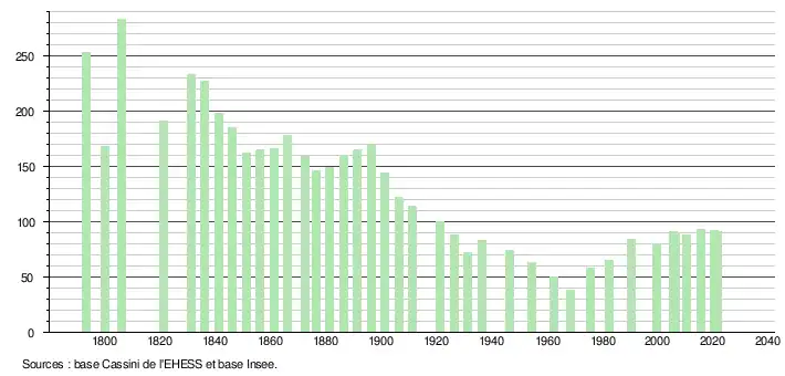 L'évolution du nombre d'habitants est connue à travers les recensements de la population effectués dans la commune depuis 1793. Pour les communes de moins de 10 000 habitants, une enquête de recensement portant sur toute la population est réalisée tous les cinq ans, les populations légales des années intermédiaires étant quant à elles estimées par interpolation ou extrapolation[15]. Pour la commune, le premier recensement exhaustif entrant dans le cadre du nouveau dispositif a été réalisé en 2005[16].