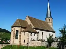 Son porche roman constitue l'un des chefs-d'œuvre de l'art sculptural médiéval alsacien. Crypte du XIe siècle. Vierge des XVe et XVIe siècles. Chaire de 1715 portée par Samson. Tombeau de sainte Richarde. Stalles du XVe siècle. L'église actuelle a été reconstruite au XVIIe siècle. La frise sculptée du massif occidental, sur 30 m de long et 0,60 de haut, déroule motifs animaux, personnages (héros de chevalerie, histoire de Richarde, etc.) ; au portail, le Christ, les saints Pierre et Paul, les premières scènes de la Genèse[25].
