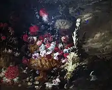 - Composition avec canards, cascade de fleurs, vase ciselé et feuilles de chardon, avant 1694, huile sur toile, 126 × 155 cm, Appartements royaux, Palais Pitti, Florence. Réalisé avant son départ en Espagne[3].