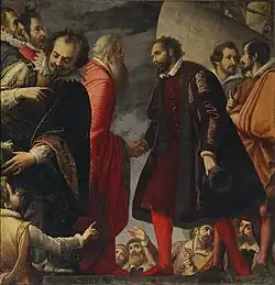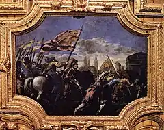 Après la prise de Padoue, l'empereur Maximilien Ier décide de reprendre la ville et envoie trente-mille soldats pour reprendre la cité vénète[16]. Le siège de Padoue, le plus important tenu par la Sérénissime dans une ville italienne depuis , est levé après plus de deux mois et l'implication d'une grande partie de l'armée vénitienne[N 8],[17],[18]. C'est lors de ce siège qu'il tient un discours qui marque les patriciens: réunissant les condottieri dans la basilique Sainte-Justine, il leur fait promettre sur un missel de se battre jusqu'à la libération de l'Italie[grec 1].