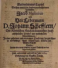 Les autorités protestantes attaquent et dénoncent alors Silesius par écrit, dans de nombreux pamphlets, et critiquent sa récente foi catholique, comme elles stigmatisent ou raillent ses croyances et ses visions mystiques, le présentant soit comme un illuminé soit comme un margoulin. En témoigne une caricature tirée de Wohlverdientes Kapitel (« Une remontrance bien méritée »), 1664 (voir ci-dessous en bibliographie), qui le dépeint comme un colporteur de potions « miracles »[18], de chapelets, de cartes et de dés à jouer, et d'autres marchandises d’escroc[19].