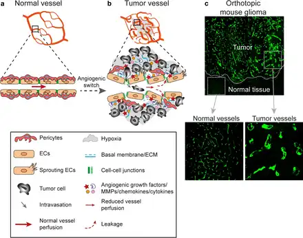 De petites tumeurs dormantes dépourvues de formation active de vaisseaux sanguins peuvent fréquemment être observées dans les tissus humains et dans des modèles murins génétiquement modifiés de carcinome aux premiers stades de la progression du cancer. La progression tumorale s'accompagne souvent d'une croissance interne des vaisseaux sanguins, ce qui correspond à la nécessité pour les cellules malignes d'avoir accès au système circulatoire pour se développer. Les tumeurs peuvent être vascularisées soit par cooptation du système vasculaire préexistant[6], soit en induisant la formation de nouveaux vaisseaux sanguins par le biais d'une variété de mécanismes moléculaires et cellulaires. L'homéostasie vasculaire est régulée par un grand nombre de facteurs pro et antiangiogéniques. Lorsque ceux-ci sont en équilibre, le système vasculaire est au repos et les cellules endothéliales ne prolifèrent pas. L'initiation de la formation de vaisseaux sanguins est induite lorsque la signalisation pro-angiogénique est dominante, un processus qui, dans les tumeurs, a été appelé « commutateur angiogénique » (angiogenic switch)[7]. Le commutateur angiogénique libère les tumeurs de leur dormance et déclenche une croissance rapide des cellules malignes en association avec la formation de nouveaux vaisseaux sanguins. Le développement de souris génétiquement modifiées modélisant la progression tumorale à plusieurs stades a joué un rôle déterminant dans l’étude du changement angiogénique. Dans ce modèle, les tumeurs se développent séquentiellement chez les souris porteuses du transgène, commençant par des amas non angiogéniques de cellules dysplasiques, dont une proportion se développe ensuite en petits îlots tumoraux angiogéniques pouvant évoluer vers de grosses tumeurs vascularisées métastasant dans le poumon[8]. En combinant ce modèle et d'autres modèles de tumeurs murines avec des modèles avancés d'angiogenèse in vitro et in vivo[9], un large éventail de facteurs et de mécanismes cellulaires ont été décrits pouvant initier la formation de vaisseaux dans les tumeurs. Le commutateur angiogénique peut être déclenché soit par des altérations génétiques supplémentaires des cellules tumorales, conduisant à une prolifération accrue et à une hypoxie ou à l'expression de facteurs pro-angiogéniques, soit par une inflammation associée à la tumeur et un recrutement de cellules immunitaires.