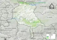 L'occupation des sols de la commune, telle qu'elle ressort de la base de données européenne d’occupation biophysique des sols Corine Land Cover (CLC), est marquée par l'importance des forêts et milieux semi-naturels (65,5 % en 2018), une proportion identique à celle de 1990 (65,5 %). La répartition détaillée en 2018 est la suivante : forêts (58,3 %), prairies (27,4 %), milieux à végétation arbustive et/ou herbacée (7,2 %), zones agricoles hétérogènes (4,1 %), eaux continentales[Note 6] (2,3 %), zones urbanisées (0,7 %)[45]. L'évolution de l’occupation des sols de la commune et de ses infrastructures peut être observée sur les différentes représentations cartographiques du territoire : la carte de Cassini (XVIIIe siècle), la carte d'état-major (1820-1866) et les cartes ou photos aériennes de l'IGN pour la période actuelle (1950 à aujourd'hui)[Carte 2].