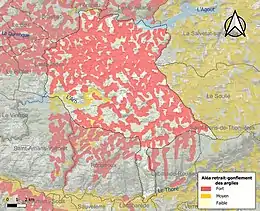 La commune est vulnérable au risque de mouvements de terrains constitué principalement du retrait-gonflement des sols argileux[51]. Cet aléa est susceptible d'engendrer des dommages importants aux bâtiments en cas d’alternance de périodes de sécheresse et de pluie. 62,9 % de la superficie communale est en aléa moyen ou fort (76,3 % au niveau départemental et 48,5 % au niveau national). Sur les 684 bâtiments dénombrés sur la commune en 2019, 557 sont en aléa moyen ou fort, soit 81 %, à comparer aux 90 % au niveau départemental et 54 % au niveau national. Une cartographie de l'exposition du territoire national au retrait gonflement des sols argileux est disponible sur le site du BRGM[52],[Carte 3].