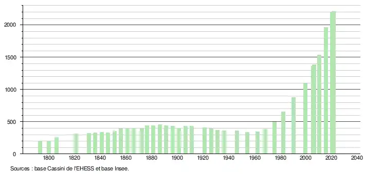| L'évolution du nombre d'habitants est connue à travers les recensements de la population effectués dans la commune depuis 1793. Pour les communes de moins de 10 000 habitants, une enquête de recensement portant sur toute la population est réalisée tous les cinq ans, les populations légales des années intermédiaires étant quant à elles estimées par interpolation ou extrapolation[29]. Pour la commune, le premier recensement exhaustif entrant dans le cadre du nouveau dispositif a été réalisé en 2005[30]. En 2021, la commune comptait 2 207 habitants[Note 3], en augmentation de 12,43 % par rapport à 2015 (Landes : +4,9 %, France hors Mayotte : +1,84 %). |