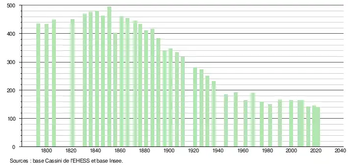 L'évolution du nombre d'habitants est connue à travers les recensements de la population effectués dans la commune depuis 1793. Pour les communes de moins de 10 000 habitants, une enquête de recensement portant sur toute la population est réalisée tous les cinq ans, les populations légales des années intermédiaires étant quant à elles estimées par interpolation ou extrapolation[22]. Pour la commune, le premier recensement exhaustif entrant dans le cadre du nouveau dispositif a été réalisé en 2008[23].