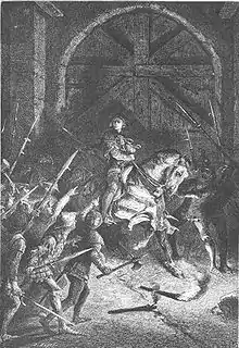 Étienne Marcel surpris porte Saint-Antoine. Gravure de 1862