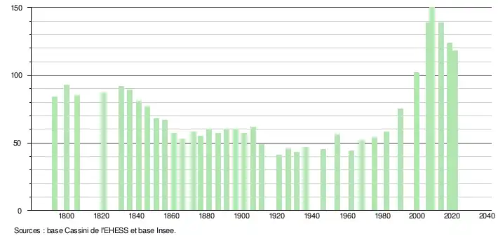 L'évolution du nombre d'habitants est connue à travers les recensements de la population effectués dans la commune depuis 1793. Pour les communes de moins de 10 000 habitants, une enquête de recensement portant sur toute la population est réalisée tous les cinq ans, les populations légales des années intermédiaires étant quant à elles estimées par interpolation ou extrapolation[19]. Pour la commune, le premier recensement exhaustif entrant dans le cadre du nouveau dispositif a été réalisé en 2008[20].