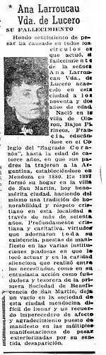 Vers 1900 Anna Larroucau, déjà veuve, est la fondatrice de la première association de bienfaisance de San Martín, à Mendoza, où elle travaille pour l'éducation et le bien-être de l'enfance de sa région. Pendant plusieurs années elle dirige l'association et en est la trésorière.