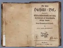 - ...sin mans Ära, husets krona, husfolkets glädje, wännernas frögd, de fattigas hugswalerska, de tröstlösas råd, de bertryktas tillflygt, och slutligen elaka grannars afunds föremål.; quoted in Helmius, pp. 67–70