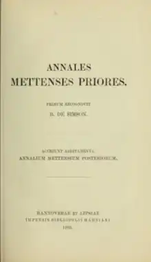 - Bernhard von Simson (éd.), Annales Mettenses priores, Monumenta Germaniæ Historica, Hanovre, Hahn, 1905.