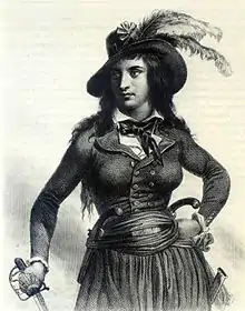![]() Portrait par Denis Auguste Marie Raffet (1804-1860). Denis Auguste Marie Raffet a gravé ce portrait de Théroigne de Méricourt en amazone serré à la taille (ample jupe rouge vif), les cheveux flottants, la tète couverte d'un chapeau rond orné d'un panache noir, deux pistolets à la taille, une épée dans la main droite. Ce portrait ressemble à celui de 1845[67]. Les traits du visage sont identiques. |