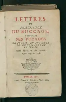 De tous ses ouvrages, ses Lettres sur l'Angleterre, la Hollande et l'Italie ont également obtenu beaucoup de compliments. Les Lettres sur l'Italie, qu'elle publie en 1755, sont une version retravaillée de véritables lettre envoyées par Anne-Marie du Boccage à sa sœur lors de son voyage en Italie. Elles constituent le premier récit féminin de voyage en Italie[2].