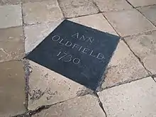 Oldfield est décédé le 23 octobre 1730 à l'âge de 47 ans, au 60 Grosvenor Street, Londres[16]. Elle partage ses biens entre ses deux fils. Elle est enterrée dans l'abbaye de Westminster, sous le monument à Congreve. Son compagnon, Churchill, demande l'autorisation d'y ériger un monument à sa mémoire, mais le doyen de Westminster refuse[17].
