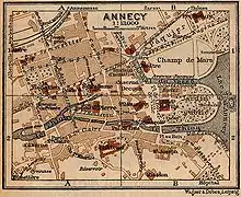Le territoire d'Annecy est divisé en deux parties qui se distinguent par le relief, l'urbanisme et la végétation. Le nord et le sud-ouest sont plats, encadrés à l'est par la colline d'Annecy-le-Vieux, qui est en fait une langue morainique, à l'ouest par la dépression occupée par le Fier, et la colline de Seynod et de Gevrier. Fortement urbanisée, la ville s'y étale avec la majorité de ses équipements. Le sud-est est, quant à lui, occupé par la montagne du Semnoz. Très peu construit ou aménagé, sauf à son extrémité nord, il est occupé en majeure partie par une forêt de conifères plantée au XIXe siècle sur le Crêt du Maure. La commune se situe sur une partie des rives nord et ouest du lac d'Annecy[2]. Cette situation lacustre a fortement influencé son émergence avec les canaux du Thiou, du Vassé, de Saint-Dominique, le port de plaisance des Marquisats et les deux plages des Marquisats et de l'Impérial.