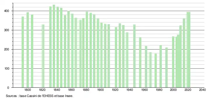 L'évolution du nombre d'habitants est connue à travers les recensements de la population effectués dans la commune depuis 1793. Pour les communes de moins de 10 000 habitants, une enquête de recensement portant sur toute la population est réalisée tous les cinq ans, les populations légales des années intermédiaires étant quant à elles estimées par interpolation ou extrapolation[18]. Pour la commune, le premier recensement exhaustif entrant dans le cadre du nouveau dispositif a été réalisé en 2004[19].