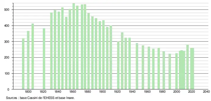 L'évolution du nombre d'habitants est connue à travers les recensements de la population effectués dans la commune depuis 1793. Pour les communes de moins de 10 000 habitants, une enquête de recensement portant sur toute la population est réalisée tous les cinq ans, les populations légales des années intermédiaires étant quant à elles estimées par interpolation ou extrapolation[20]. Pour la commune, le premier recensement exhaustif entrant dans le cadre du nouveau dispositif a été réalisé en 2004[21].