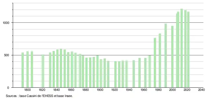 L'évolution du nombre d'habitants est connue à travers les recensements de la population effectués dans la commune depuis 1793. Pour les communes de moins de 10 000 habitants, une enquête de recensement portant sur toute la population est réalisée tous les cinq ans, les populations légales des années intermédiaires étant quant à elles estimées par interpolation ou extrapolation[22]. Pour la commune, le premier recensement exhaustif entrant dans le cadre du nouveau dispositif a été réalisé en 2007[23].