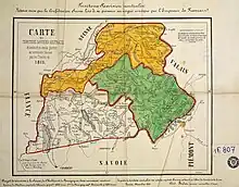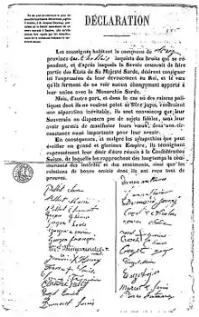 Le , Napoléon III annonce au Corps législatif son intention de réclamer le pourboire convenu à Plombières, c'est-à-dire de « réclamer le versant occidental des montagnes des Alpes »[23], à savoir Nice et la Savoie, en échange de son appui à l’unité italienne. Les conseils divisionnaires, réunis à Chambéry, émettent un vœu en faveur du maintien de l'unité savoisienne le (c.-à-d. le refus d'une partition de la Savoie entre la Suisse et la France).