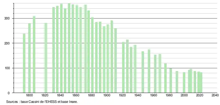 L'évolution du nombre d'habitants est connue à travers les recensements de la population effectués dans la commune depuis 1793. Pour les communes de moins de 10 000 habitants, une enquête de recensement portant sur toute la population est réalisée tous les cinq ans, les populations légales des années intermédiaires étant quant à elles estimées par interpolation ou extrapolation[22]. Pour la commune, le premier recensement exhaustif entrant dans le cadre du nouveau dispositif a été réalisé en 2008[23].