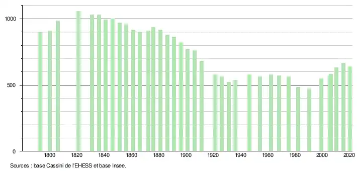 L'évolution du nombre d'habitants est connue à travers les recensements de la population effectués dans la commune depuis 1793. Pour les communes de moins de 10 000 habitants, une enquête de recensement portant sur toute la population est réalisée tous les cinq ans, les populations légales des années intermédiaires étant quant à elles estimées par interpolation ou extrapolation[37]. Pour la commune, le premier recensement exhaustif entrant dans le cadre du nouveau dispositif a été réalisé en 2005[38].