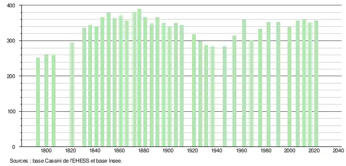 L'évolution du nombre d'habitants est connue à travers les recensements de la population effectués dans la commune depuis 1793. Pour les communes de moins de 10 000 habitants, une enquête de recensement portant sur toute la population est réalisée tous les cinq ans, les populations légales des années intermédiaires étant quant à elles estimées par interpolation ou extrapolation[17]. Pour la commune, le premier recensement exhaustif entrant dans le cadre du nouveau dispositif a été réalisé en 2006[18].